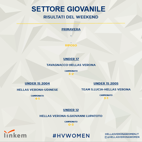 Questi tutti i risultati del settore giovanile femminile dell’Hellas Verona Women, come riportati sul sito ufficiale della società gialloblù.