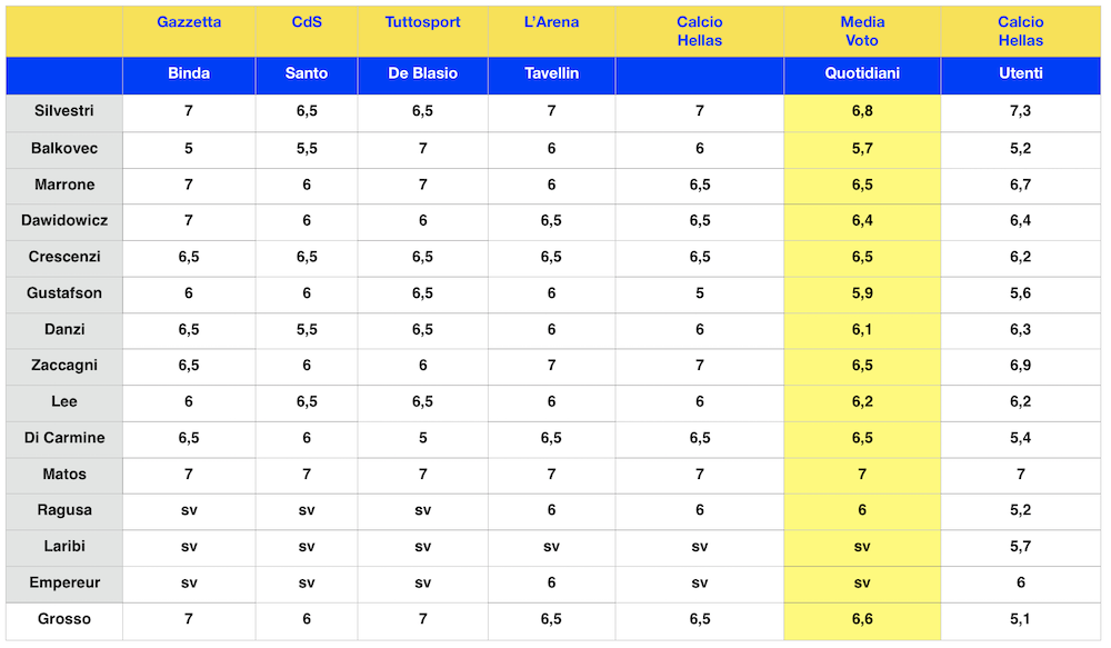 Premiate anche le prestazioni di Zaccagni e Marrone, mentre dietro la lavagna finiscono Balkovec e Gustafson