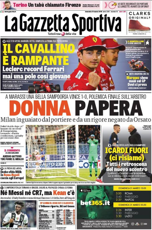 La sconfitta del Milan, il nuovo “caso-Icardi“, la Juventus di Kean e la Ferrari: sono veramente tanti gli argomenti delle copertine odierne dei maggiori quotidiani sportivi.