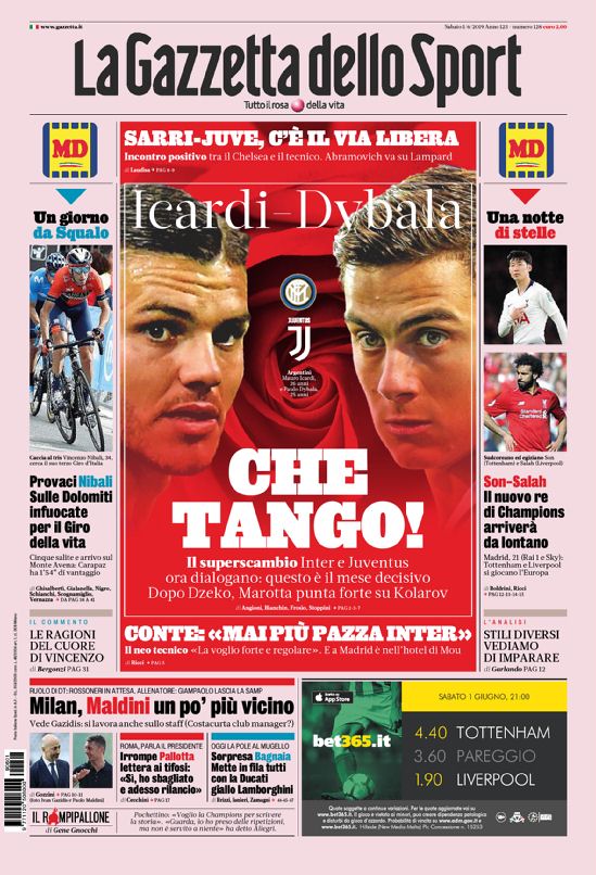 Queste le prime pagine dei quotidiani sportivi in edicola oggi, sabato 1 giugno