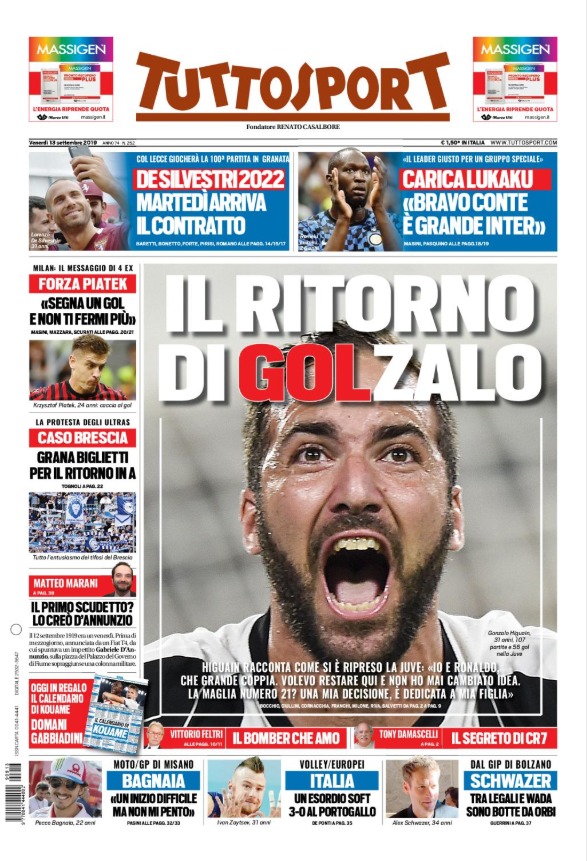 Da Koulibaly a Higuain, passando per il ritorno in panchina di Sarri e l’Inter di Conte, c’è ancora tanta Serie A sulle copertine dei maggiori quotidiani sportivi nazionali.