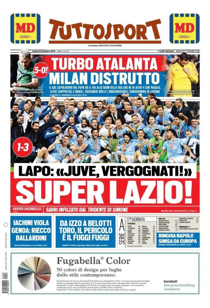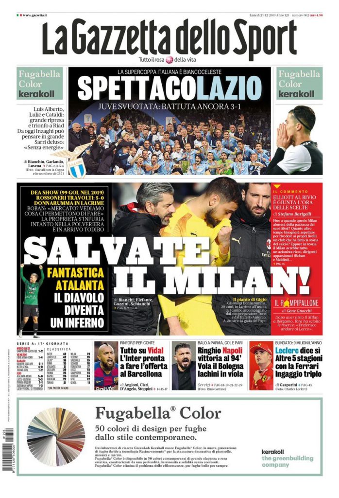 Le prime pagine dei quotidiani sportivi in edicola oggi, lunedì 23 dicembre 2019