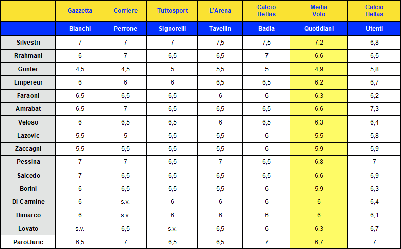Questa, infatti, la tabella con i giudizi di Gazzetta, Corriere, Tuttosport, L’Arena e CalcioHellas: