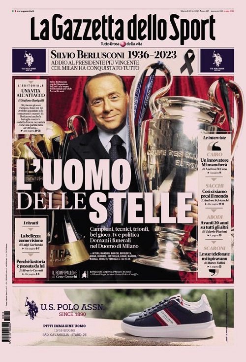 Il commosso ricordo del presidente Silvio Berlusconi è su tutte le copertine odierne dei maggiori quotidiani sportivi nazionali.