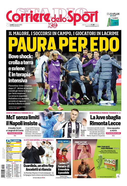 Il malore accusato da Bove durante Fiorentina-Inter ĆØ ovviamente l’argomento principale delle copertine odierne dei maggiori quotidiani sportivi nazionali.