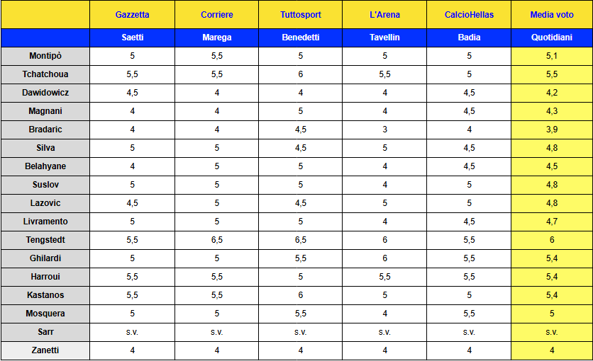Ecco dunque la tabella riportante tutti i voti di Gazzetta, Corriere, Tuttosport, L’Arena e CalcioHellas: