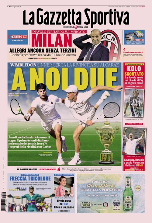 Il calciomercato e la finale di Wimbeldon tra Sinner e Alcaraz si prendono le copertine odierne dei maggiori quotidiani sportivi...