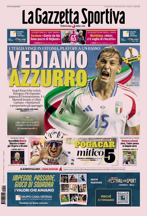 La vittoria dell’Italia sull’Estonia monopolizza le copertine odierne dei maggiori quotidiani sportivi nazionali. Queste infatti le prime pagine di Gazzetta,...