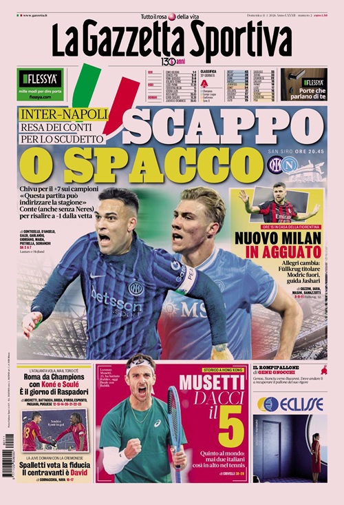 Il big match tra Napoli e Inter e il calciomercato si prendono le copertine odierne dei maggiori quotidiani sportivi nazionali....