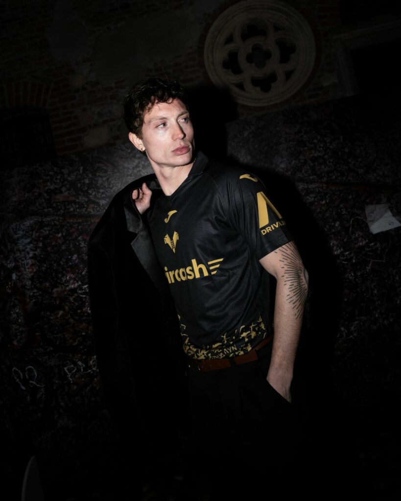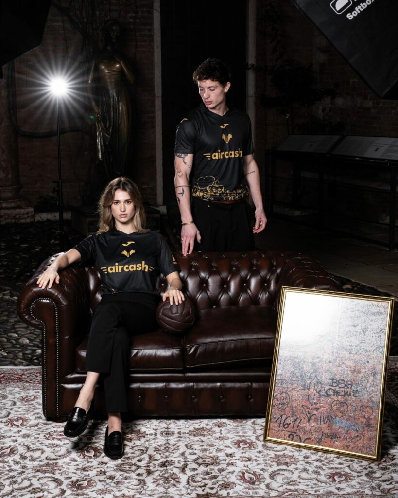 La divisa speciale, di colore nero con scritte e simboli oro, nel fondo della maglia richiama le dediche che si trovano all’ingresso della Casa di Giulietta nel centro della città. Pensieri spontanei, intimi, lasciati da giovani innamorati provenienti da ogni parte del mondo come segni di reciproco amore. Lo stesso sentimento che accompagna e contraddistingue da sempre i tifosi dell’Hellas per la squadra della propria città.