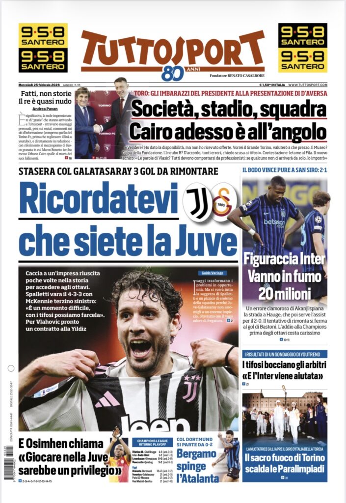 La Champions League occupa le prime pagine dei quotidiani sportivi in edicola oggi, mercoledì 25 febbraio 2026. Ecco quelle di Corriere dello Sport, Gazzetta dello Sport e Tuttosport:
