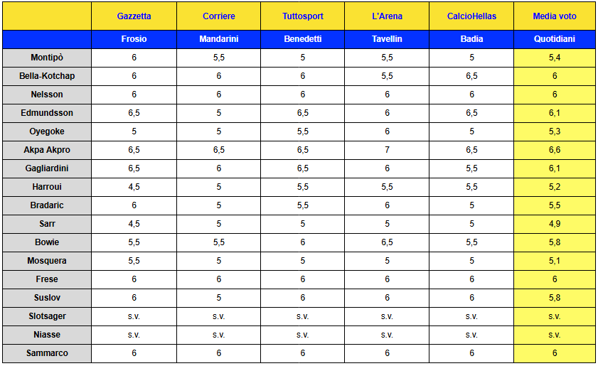 Guardando infatti ai voti di Gazzetta, Corriere, Tuttosport, L’Arena e CalcioHellas, a strappare almeno un “6” sono anche i tre difensori titolari, Gagliardini, Frese e mister Sammarco.