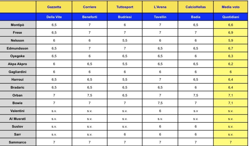 Il Verona torna alla vittoria contro il Bologna e i migliori per la stampa sono i due attaccanti Orban e Bowie con la media del 7,1. Bene anche Frese e Montipò nel reparto arretrato. L’unica insufficienza è rappresentata dal danese Nelsson con la media del 5,9.