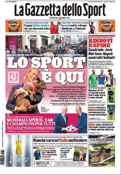 Le prime pagine dei quotidiani sportivi in edicola oggi, venerdƬ 20 agosto 2019