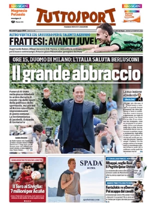 L’addio al presidente Silvio Berlusconi e le prime notizie di calciomercato occupano le copertine dei principali giornali sportivi nazionali. Queste...