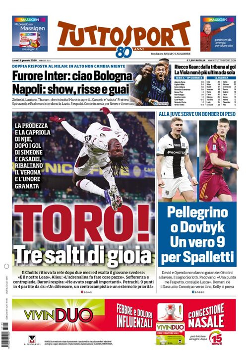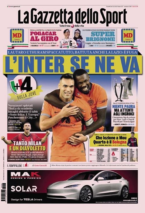 A occupare le copertine dei principali quotidiani sportivi nazionali ĆØ l’Inter che, dopo il successo sulla Lazio, prova la volata...