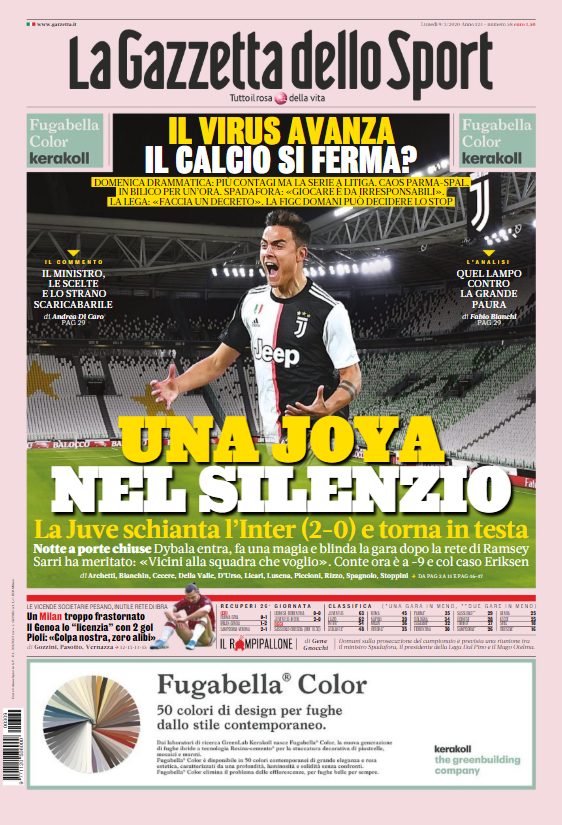 Sono il Derby d’Italia e la possibile sospensione del campionato a tenere banco sulle copertine odierne dei maggiori quotidiani sportivi...