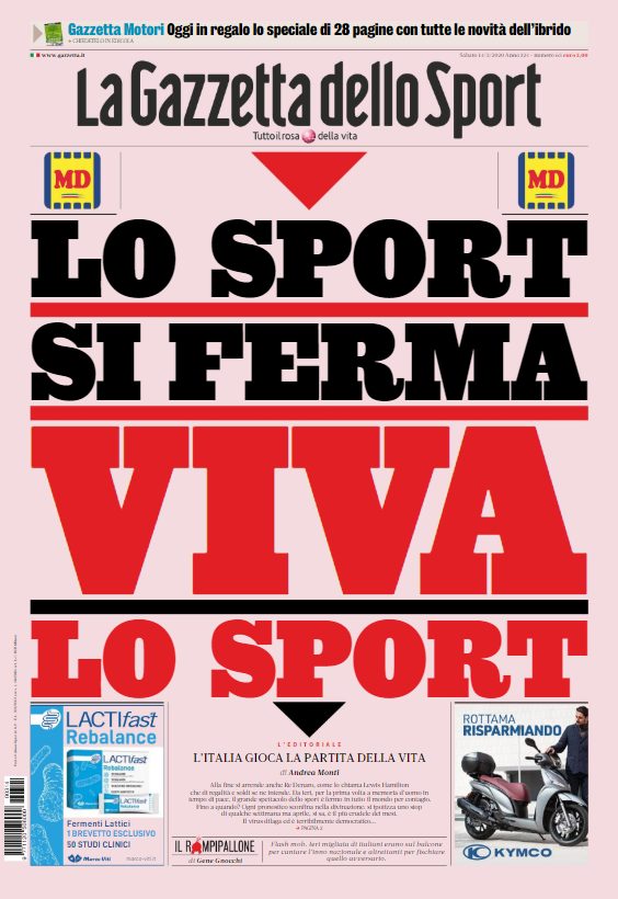 Lo stop degli sport causa Coronavirus continua a essere il protagonista assoluto delle copertine dei maggiori quotidiani sportivi nazionali. Queste...